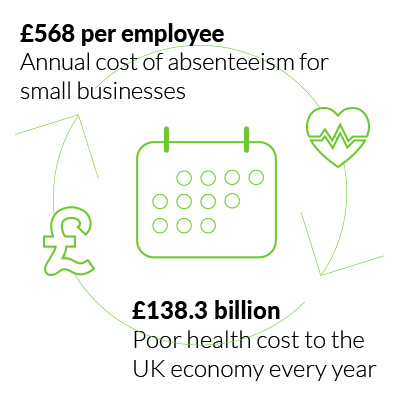 Poor health at work costs the UK economy a staggering £138.3 billion every year, with British businesses losing an average of 49.7 days per employee due to poor health, through absenteeism and presenteeism combined (Vitality). For small businesses, absenteeism alone costs an estimated £568 per employee annually (Moorepay).